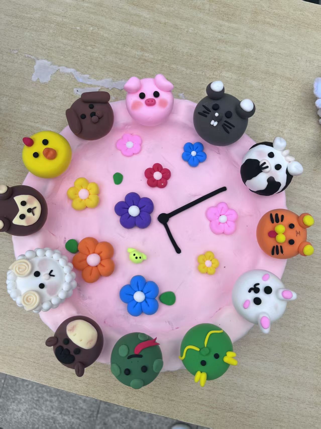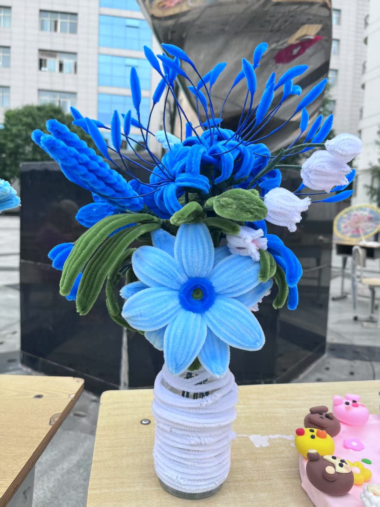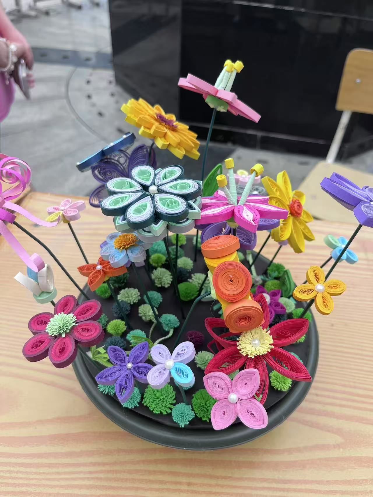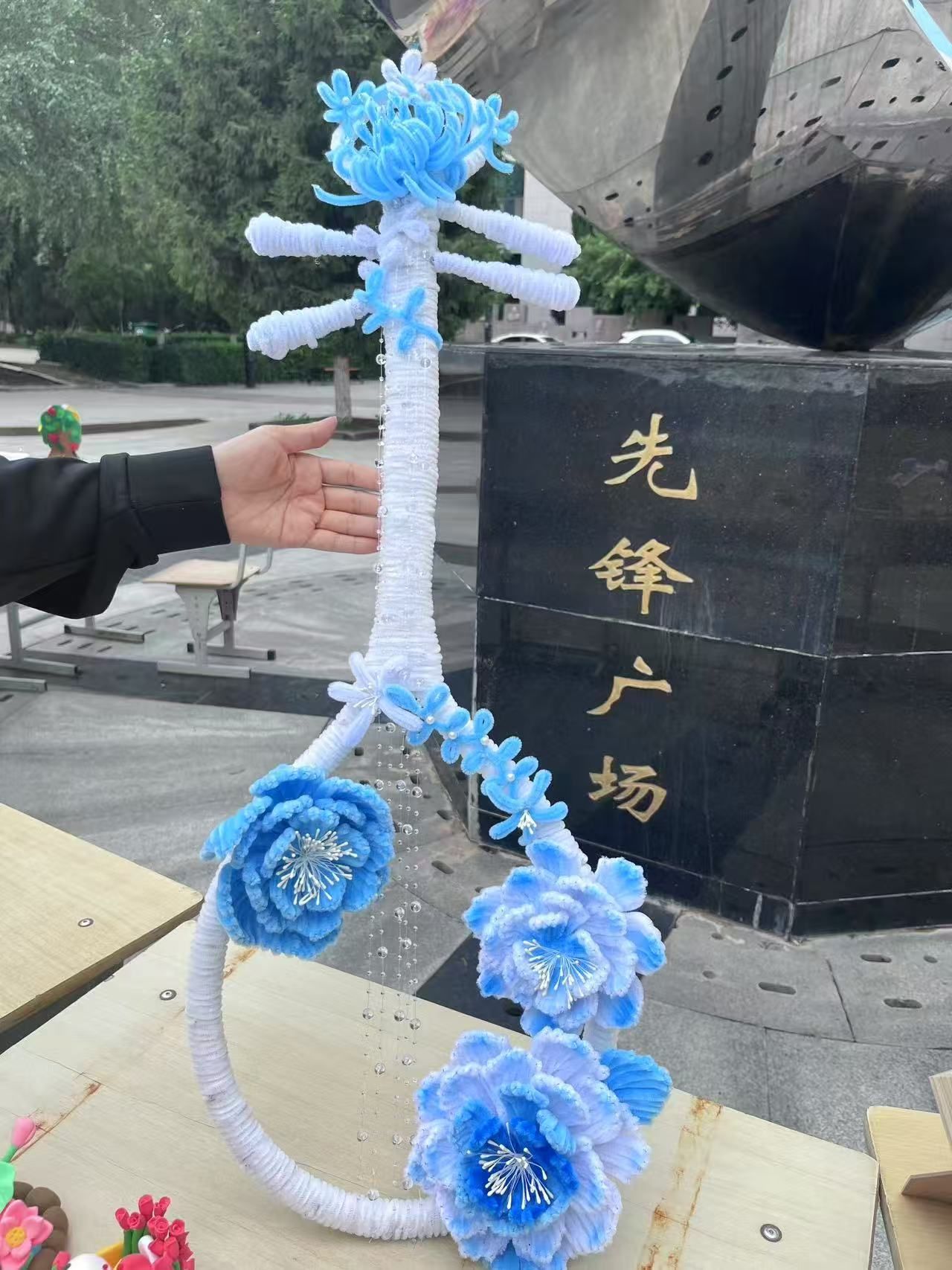 在这些作品中有衍纸生花,彩色纸条被巧妙卷曲、粘贴,形成了娇艳的花朵和灵动的蜻蜓,仿佛是流动的色彩诗篇;扭扭棒焕彩,用扭扭棒制作的的簪花花环,如同春天里最美的风景,插在花瓶中的扭扭棒花束,散发着温馨的气息;泡泡泥造境趣,将泡泡泥变成形态各异的大自然生物、灵动的珊瑚与神秘的礁石,构建出一个充满想象力的微观世界,将生肖形象以手工形式呈现于时钟表盘,既让传统生肖文化变得直观可感,又赋予时钟艺术价值;织布织梦,用不织布缝制,凭借丰富色彩与别致造型,创作出生动形象,传递温暖质朴的美感。