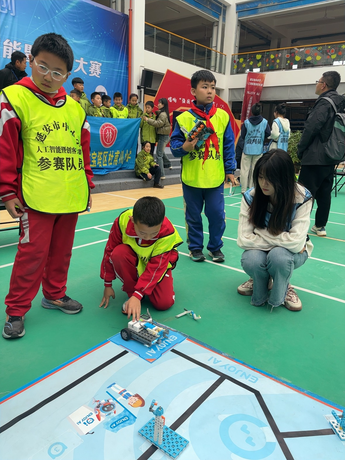本次大赛共有2381支队伍、2597名学生报名参赛;经过对全市Scratch图形化编程等部分赛项进行初赛选拔后,共有712支队伍、933名学生参加决赛。大赛共设ENJOY AI“运动会闭幕式”普及赛、ENJOY AI“芯空社区”普及赛、ENJOY AI太空动物城比赛、WER积木教育机器人普及赛、WRO机器人任务赛、无人机障碍竞技赛、DJI编程无人机任务挑战赛、Super AI“智能家居”、创意智造、GAR未来工程师、幼儿大颗粒积木建构主题创意搭建、Scratch图形化编程、Python编程、互联网+无人驾驶主题竞赛14个赛项。志愿者除了提供技术指导,还协助裁判进行比赛时间的记录、比赛成绩的统计、维护赛场秩序等任务,我校志愿者凭借扎实的专业知识背景和技术操作功底,以及良好的沟通能力和团队协作意识,确保了比赛公平公正地进行。同时通过直接参与赛事的组织和服务工作,同学们获得了宝贵的学习机会,为将来从事教育创客和创新教学活动获得了生动的实践经验。志愿者们在活动中展现出来的团队合作精神、责任感和奉献精神,不仅赢得了社会各界的好评,也为自身的职业发展打下了坚实的基础。