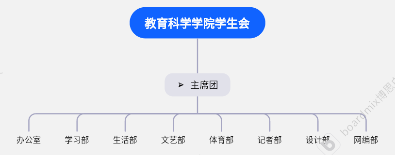 学生会现设有主席团四人,办公室、学习部、体育部、生活部、文艺部、记者部、设计部以及网编部八个部门共同完成学生会的各项日常工作。